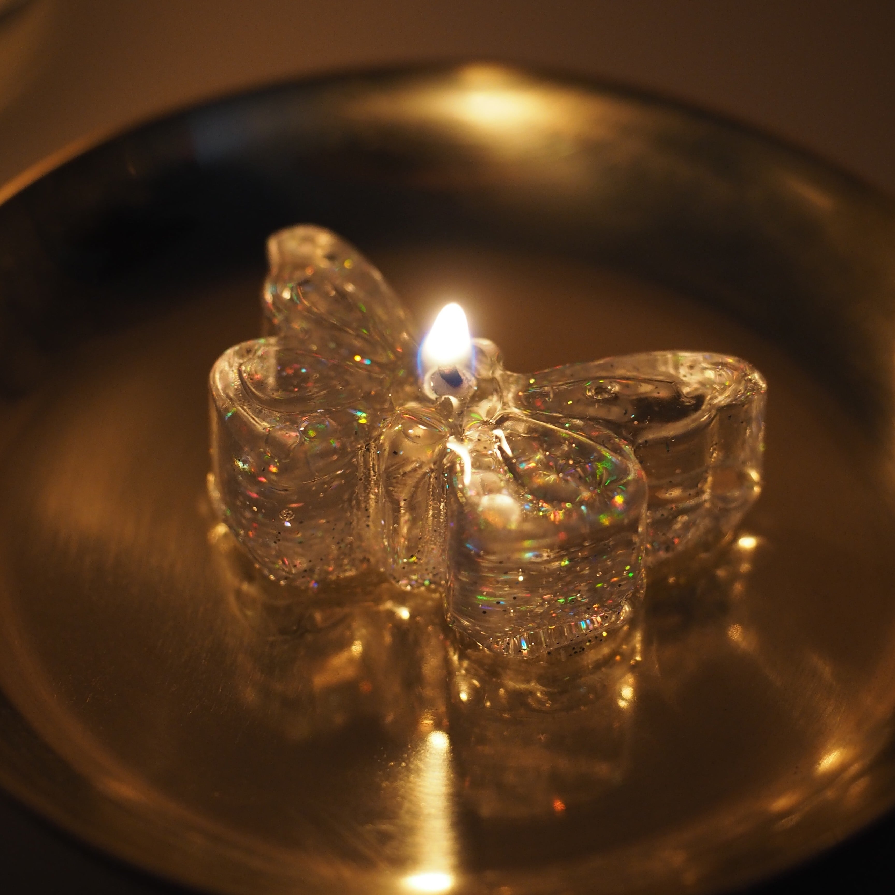 灯さなくてもラメのきらきらを楽しめますが、火を灯すと透明のワックスの中にきらめきが溢れます。