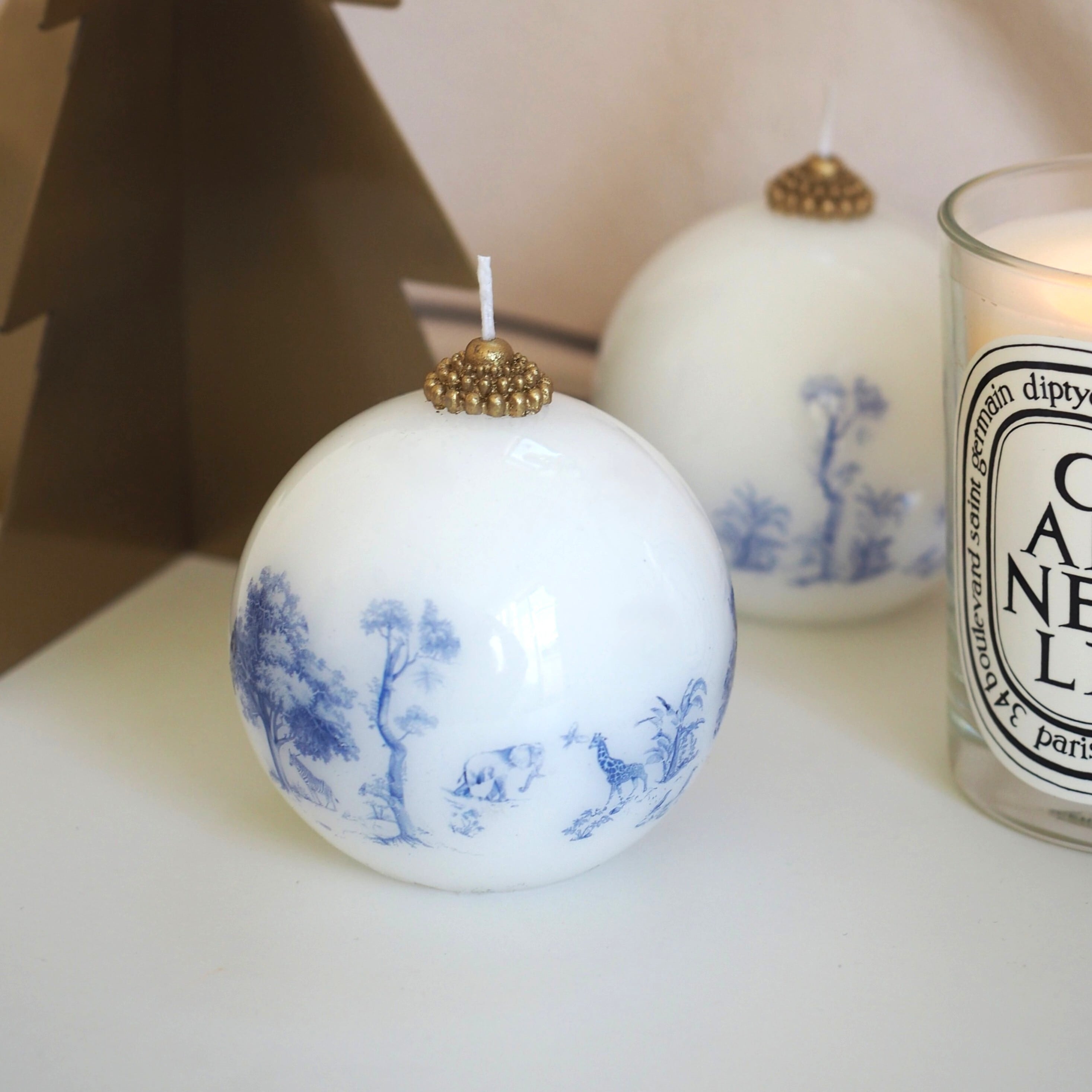 18世紀フランスの伝統的なモチーフ、「トワル・ド・ジュイ」のエレガントなデザインを球体に落とし込んだ、特別なオーナメントキャンドルです。